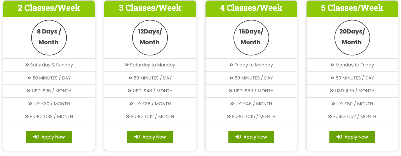 The below mentioned cost is exclusive of Free Trail Classes. You can select any of the following pre-defined plans or Contact us for a customized plan.